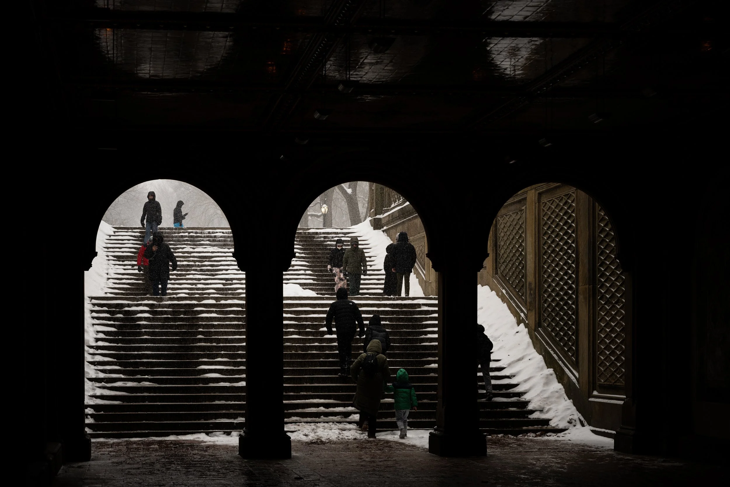 People moving across a city street, some carrying large boxes, with storefronts and buildings in the background.